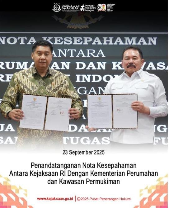 Burhanuddin melaksanakanpenandatanganan Nota Kesepahaman dengan Menteri Perumahan dan Kawasan Permukiman (PKP) Maruarar Siraitpada Selasa 23 September 2025 di Gedung Utama Kejaksaan Agung, Jakarta. Penandatanganan ini merupakantindaklanjut dari pendampingan program penyediaan lahantempat tinggal oleh Kementerian PKP.
