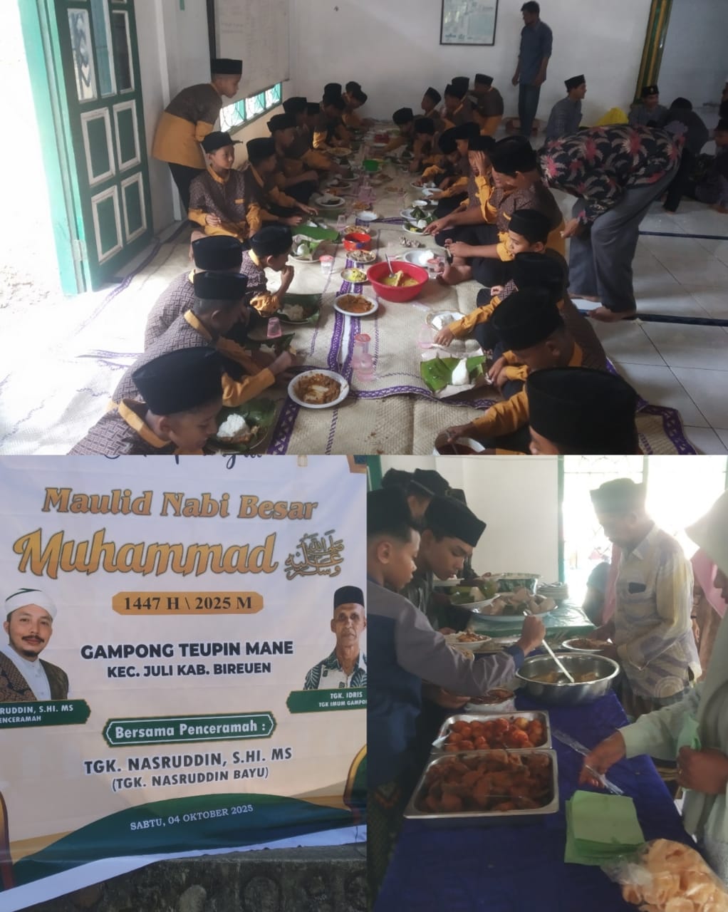 Dalam rangka memperingati maulid Nabi Muhammad SAW 1447 H didesa teupi mane Kecamatan Juli kabupaten Bireuen acara berlangsung dihalaman meunasah teupi mane setempat disantuni 20 anak yatim-piatu di desa teupi mane tersebut,sabtu (4/10/2025