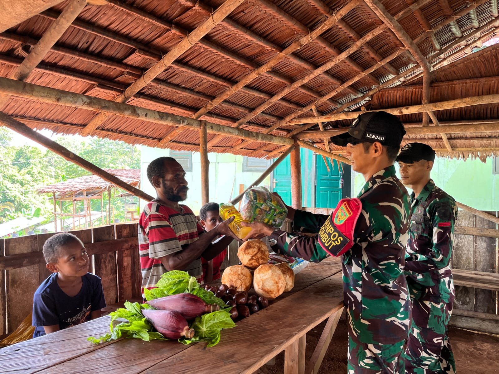 Sementara itu, Bapak Baslius Amborang menyampaikan rasa terima kasihnya atas kegiatan ini. “Kami sangat terbantu dengan kegiatan barter ini. Hasil kebun kami bisa ditukar dengan barang kebutuhan sehari-hari. Terima kasih kepada anggota pos dan Satgas yang selalu peduli dengan masyarakat,” ungkapnya.