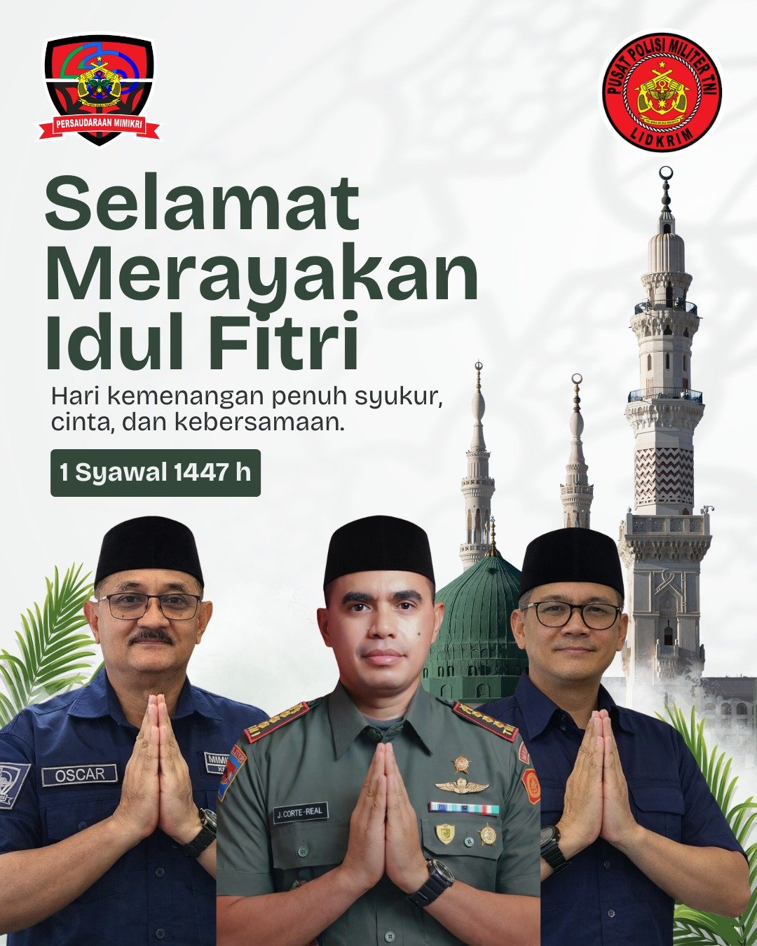 Jakarta ll detikperistiwa.co.id ll Dalam momentum perayaan Hari Raya Idul Fitri 1447 Hijriah, Persaudaraan Mimikri bersama Pusat Polisi Militer Tentara Nasional Indonesia (Puspom TNI) menyampaikan ucapan selamat kepada umat Muslim di seluruh Indonesia. Ucapan tersebut disampaikan melalui pernyataan resmi yang dipublikasikan di berbagai platform media.
