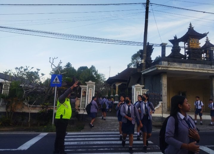 Personil Polsek Rendang Aiptu I Nyoman Pica Arta melaksanakan pengamanan pengaturan lalu lintas menyeberangkan jalan raya anak sekolah dan menghimbau untuk berhati-hati dijalan raya agar tercipta situasi yang aman kondusif, selasa (7/5/2024) pukul 06.30 wita s/d 07.45 Wita.