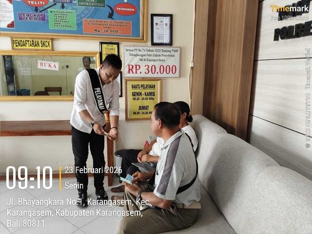 Personil Sat Intelkam Polres Karangasem melaksanakan pelayan dengan senyum sapa dan salam kepada masyarakat khususnya masyarakat yang akan membuat SKCK dalam keperluan melengkapi berkas administrasi. Pada hari ini Jumat, 27 Februari 2026.