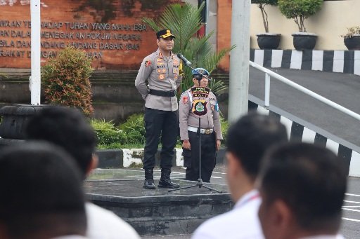 Kapolres Karangasem, AKBP I Made Santika, S.H., S.I.K., M.I.K., memimpin langsung pelaksanaan Apel Jam Pimpinan yang bertempat di Lapangan Pesat Gatra Polres Karangasem pada Senin (2/3/2026) pagi.
