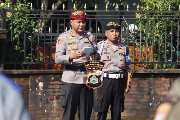 Kapolres Karangasem AKBP I Made Santika, S.H., S.I.K., M.I.K., memimpin Apel Kesiapan dalam rangka Pengamanan Upacara Keagamaan Tawur Tabuh Gentuh dan Ida Betara Turun Kabeh (IBTK) Pura Agung Besakih Tahun 2026 di Areal Parkir Terminal Kedungdung, Desa Besakih, Kecamatan Rendang, Rabu (1/4/2026).