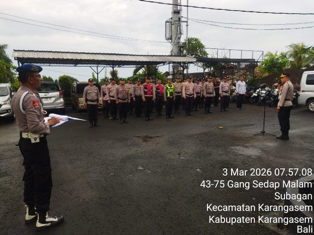 Kapolsek Karangasem, Kompol I Nyoman Merta Kariana, SH., MH., memimpin apel pagi dengan memberikan penekanan kepada seluruh personel agar tidak terlibat dalam praktik judi online, dalam bentuk apa pun. Penegasan ini disampaikan sebagai bentuk komitmen menjaga integritas dan nama baik institusi. pada Selasa, (3/3/2026).