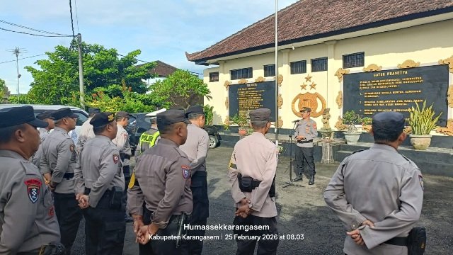 Wakapolsek, AKP I Gusti Kt. Trisna Ari Subekti, SH., MH. pimpin langsung apel pagi yang digelar di depan Mapolsek Karangasem. Pada Rabu, (25/2/2026).