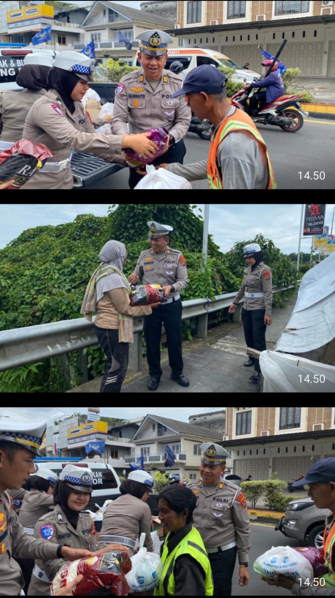 “Termasuk ada juga kita bagikan sejumlah paket sembako yang merupakan hasil dari sedekah personel kita di Ditlantas,”sambungnya.
