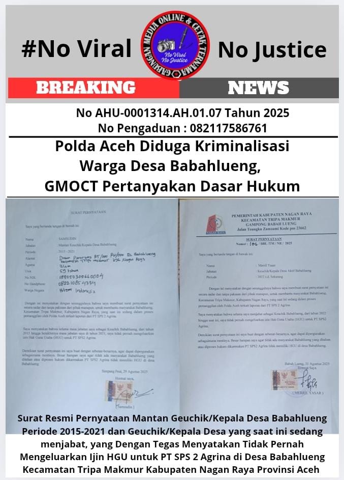 GMOCT menduga kuat Sub Tipidter IV Polda Aceh terkesan memaksakan penanganan pelaporan dari PT SPS 2 Agrina yang mencoba melakukan kriminalisasi terhadap dua orang warga Desa Babahlueng yang justru telah memiliki surat asli ijin Garap Lahan yang dikeluarkan oleh Pemerintah Desa Babahlueng. Sementara PT SPS 2 Agrina sendiri dinyatakan tidak pernah memiliki HGU di Desa Babahlueng oleh Mantan Geuchik dan Geuchik Desa Babahlueng yang saat ini sedang menjabat.