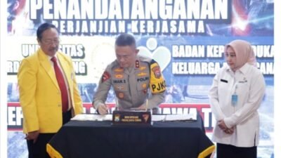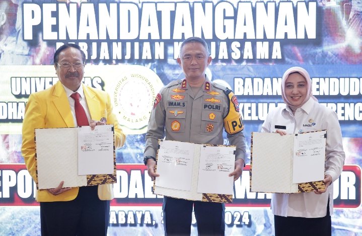 Surabaya |Jatim | Kapolda Jawa Timur Irjen Pol Imam Sugianto didampingi Waka Polda Jatim Brigjen Pol Akhmad Yusep Gunawan dan pejabat utama (PJU) Polda Jatim, melaksanakan penandatanganan naskah kerjasama antara BKKBN Jatim dan Universitas Wisnuwardhana(Unidha) Malang di Gedung Patuh Polda Jatim, Kamis (25/7/2024).