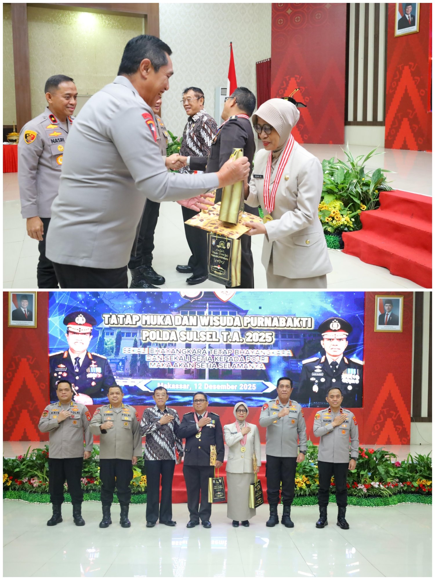 Turut hadir Wakapolda Sulsel Brigjen Pol. Nasri, S.I.K., M.H., Pejabat Utama Polda Sulsel, Ketua PP Polri Daerah Sulawesi Selatan beserta pengurus, serta para wisudawan purnabakti.