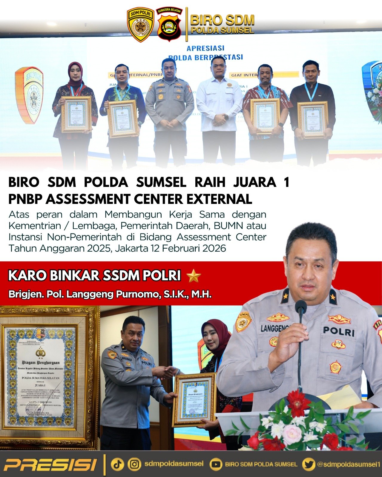 Penghargaan bergengsi tersebut diserahkan dalam acara Saresehan Asesor Assessment Center Tahun 2026, yang digelar pada Kamis, 12 Februari 2026, bertempat di Hotel Grand Sahid Jaya Jakarta. Prestasi ini diraih kembali di bawah kepemimpinan Karo SDM Polda Sumsel Kombes Pol Sudrajad Hariwibowo, S.I.K., M.Si., yang secara konsisten mendorong penguatan sistem manajemen SDM berbasis kompetensi serta memperluas jejaring kemitraan lintas sektoral. Melalui strategi kolaboratif dan pendekatan profesional dalam pengelolaan Assessment Center Polri, Polda Sumsel telah berhasil menghadirkan tata kelola pengembangan SDM yang akuntabel dan berstandar nasional.