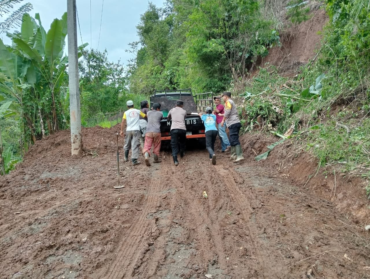 Alhamdulillah kini sudah dapat dilalui oleh Kendaraan R2 maupun R4, namun jalan masih licin. Untuk itu kami menghimbau kepada warga yg melintas untuk selalu berhati-hati”pungkasnya.