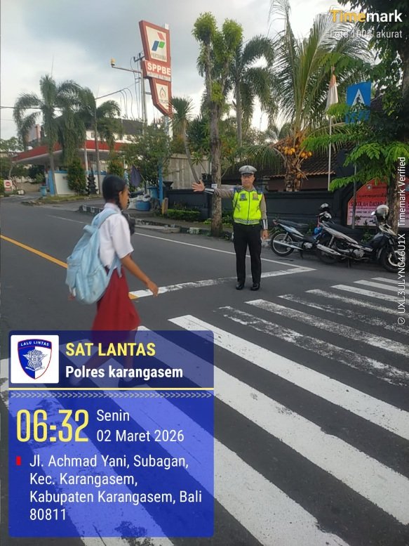 Untuk mencegah terjadinya kecelakaan lalulintas pada anak sekolah dasar serta tetap menjaga arus lalu lintas supaya lancar, personel Lantas Polres Karangasem melaksanakan penyebrangan anak sekolah demi keselamatan mereka di depan SDN 4, Subagan, Amlapura. Pada Senin, 2 Maret 2026 , pukul 06.30 Wita.