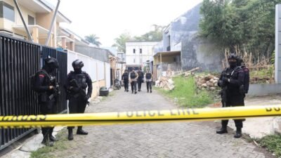 Kota Batu | Jatim | Densus 88 Anti Teror Mabes Polri dibantu oleh Tim Labfor dan Jibom Sat Brimob Polda Jatim melakukan penggeledahan dan olah TKP selama tujuh jam di rumah terduga pelaku teroris, kawasan kompleks Perumahan Bunga Tanjung, Dusun Jeding, Desa Junrejo, Kecamatan Junrejo, Kota Batu, Jawa Timur.