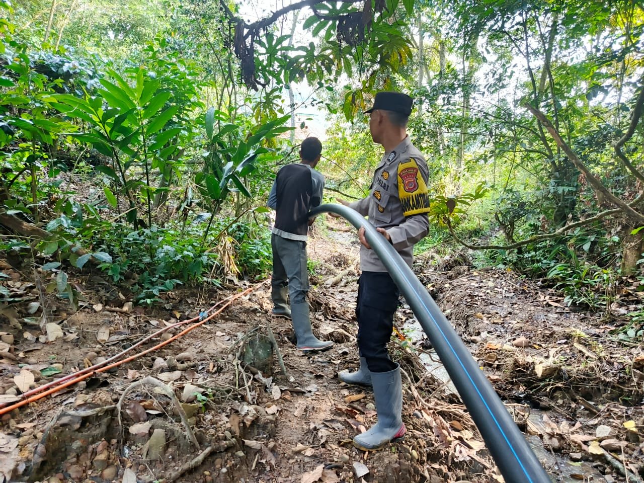 Proses pekerjaan dilakukan dengan pemasangan dan penyambungan pipa peralon dari sumber mata air menuju area permukiman. Sinergi antara personel Polri dan warga tampak kuat selama kegiatan berlangsung guna mempercepat pemulihan kebutuhan dasar masyarakat.