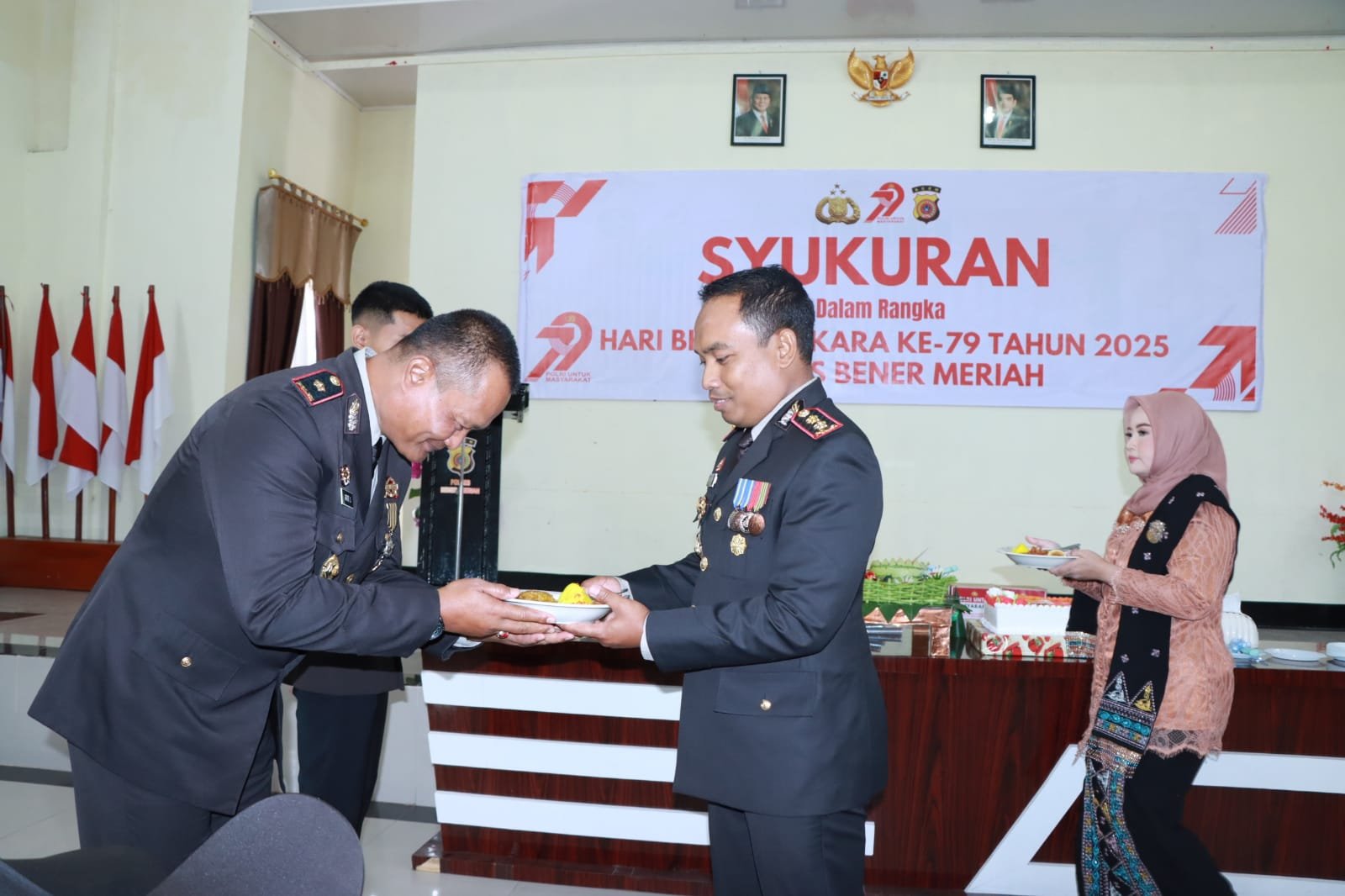 Syukuran ditandai dengan pemotongan tumpeng oleh Kapolres dan Ketua Bhayangkari Cabang Bener Meriah, yang diserahkan kepada personel tertua, Kompol Gatot Supriyanto (Kabag Ops), dan termuda, Bripda Muhammad Haiqal (Sat Samapta). Selain itu, Kapolres juga memberikan piagam dan trofi kepada para pemenang lomba Hari Bhayangkara ke-79 serta menyerahkan bantuan sosial kepada 50 anak yatim dan cenderamata kepada tiga personel purna bhakti.