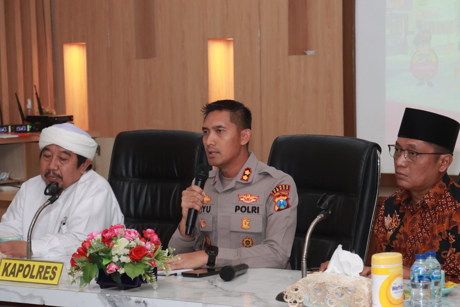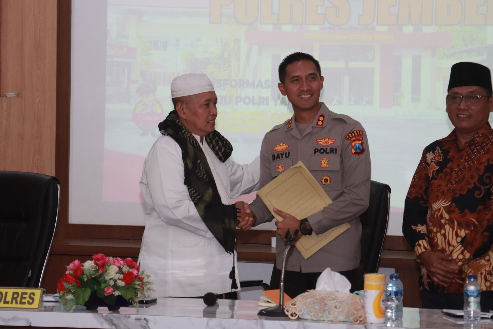 Dalam pertemuan tersebut, Kapolres didampingi jajaran PJU menyambut kedatangan sejumlah ulama dan tokoh masyarakat, diantaranya KH. Sadis Jauhari pengasuh Pondok Pesantren Assuniyah Kencong yang juga pengurus PBNU, KH. Hamid Hasbullah, Ketua MUI, Pengurus PCNU Jember, Pengurus Daerah Muhammadiyah Jember, dan sejumlah elemen masyarakat.