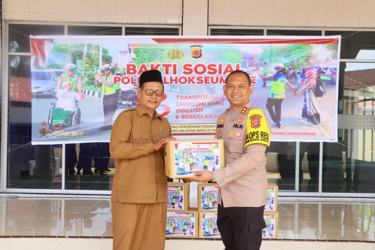 Polres Lhokseumawe menggelar Bakti sosial pembagian sembako serentak kepada masyarakat dalam rangka HUT Bhayangkara ke 78 tahun 2024 di halaman Mesjid Babul Taqwa Polres Lhokseumawe, Selasa (25/6/2024) pagi.