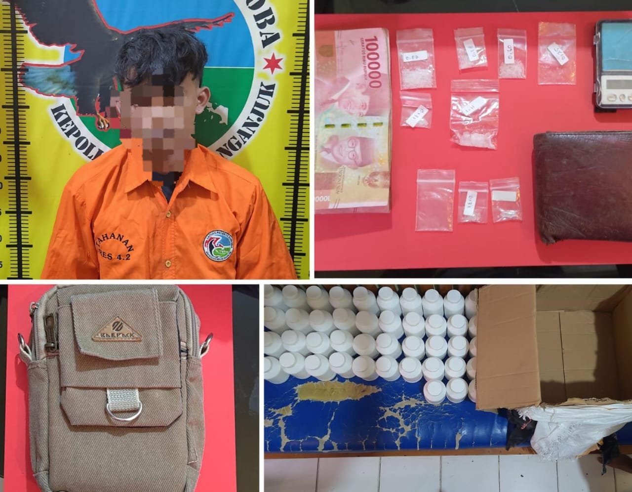 “Saat dilakukan penggeledahan di rumah tersangka MH, petugas berhasil mengamankan sabu dengan total berat 4,01 gram. Selain itu, ditemukan juga 43 botol plastik berisi Pil Dobel L, masing-masing berisi 1000 butir, uang tunai sejumlah Rp 1.000.000, timbangan digital, serta beberapa paket sabu yang disembunyikan dalam tas selempang,” ungkap IPTU Sugiarto.