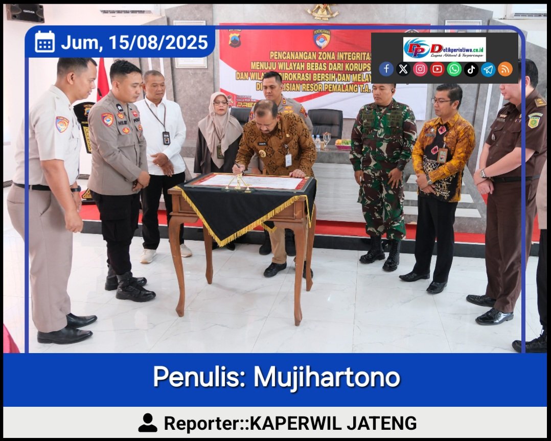 Pemalang Jateng Https//detikperistiwa.co.id – Polres Pemalang mencanangkan pembangunan Zona Integritas menuju Wilayah Bebas Korupsi (WBK) dan Wilayah Birokrasi Bersih dan Melayani (WBBM) di Aula Tribrata Mapolres Pemalang, Rabu (13/8/2025). Langkah ini bertujuan mewujudkan budaya kerja bebas dari praktik korupsi, profesional, dan berintegritas tinggi di seluruh lini pelayanan.