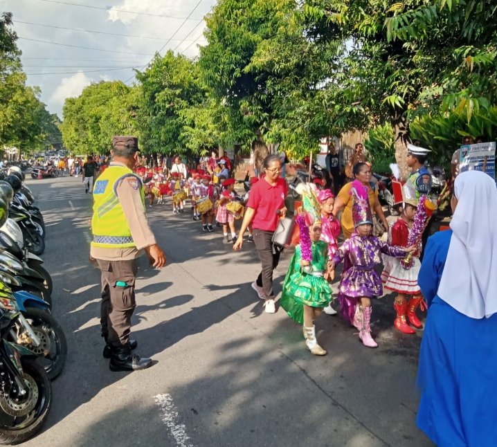 Pengamanan pawai Drumband TK Santa Maria Immaculata Tabanan. dipimpin Kapolsek Tabanan Kompol I Nyoman Sumantara, S.H.,M.H, dengan kuat personil 15 orang gabungan personil Polres Tabanan dan Polsek Tabanan.
