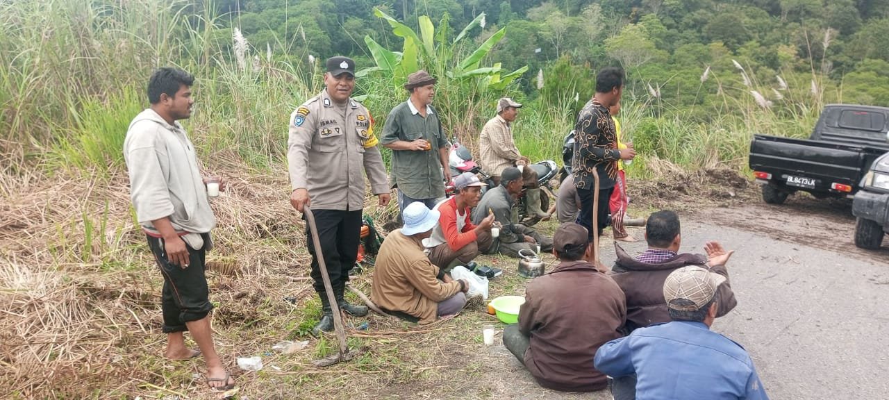 Bener Meriah – Personel Polsek Bandar bersama warga melaksanakan kegiatan gotong royong membersihkan badan jalan dari timbunan tanah dan batu di Kampung Bathin Baru, Kecamatan Bandar, Kabupaten Bener Meriah.
