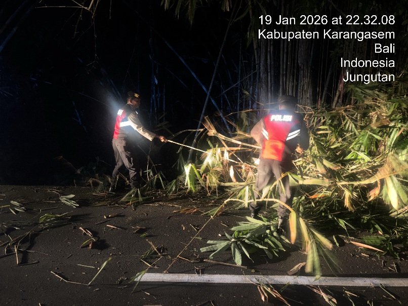 Personel Polsek Bebandem menunjukkan aksi sigap dalam menjaga keselamatan pengguna jalan. Di tengah pelaksanaan Patroli KRYD Barcode Blue Light Patrol pada Senin malam (19/1/2026). Petugas melakukan evakuasi batang bambu yang roboh dan melintang di jalan raya wilayah Banjar Dinas Mumbul, Desa Jungutan.
