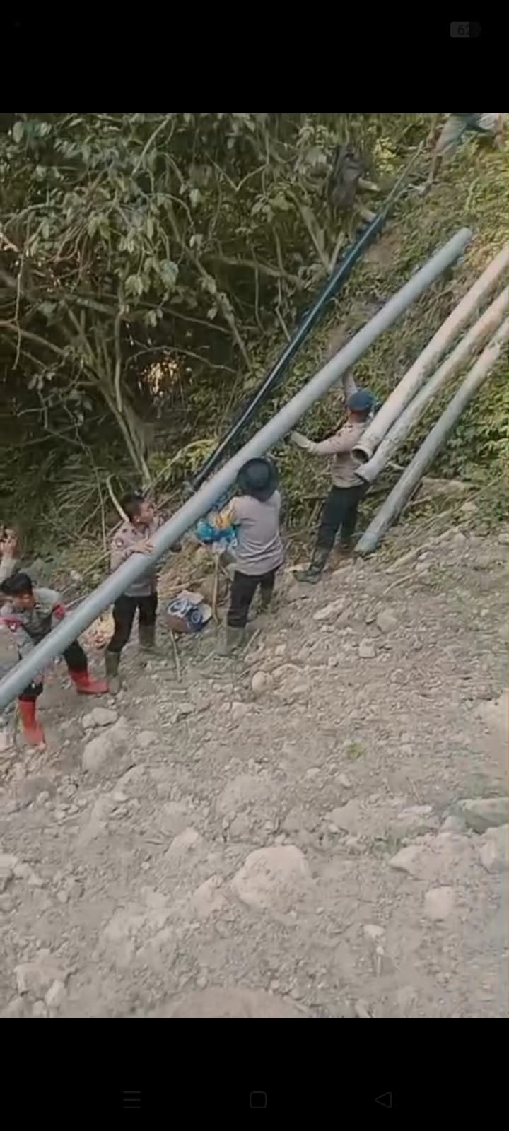 Akibat longsor yang terjadi sebelumnya, pipa air mengalami kerusakan cukup parah sehingga mengganggu distribusi air bersih bagi masyarakat. Melalui semangat kebersamaan dan gotong royong, personel Polsek Ketol, Brimob, serta masyarakat setempat bahu membahu mengangkat dan memasang pipa, melewati medan perbukitan dan lereng gunung.