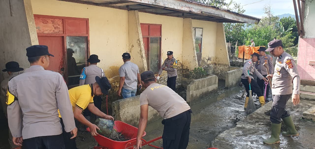 Personel Polsek Kota Takengon jajaran Polres Aceh Tengah melaksanakan kegiatan gotong royong pemulihan fasilitas pendidikan di SD Negeri 9 Kebayakan, Kecamatan Kebayakan, Kabupaten Aceh Tengah, Sabtu (14/2/2026) pukul 09.00 WIB.