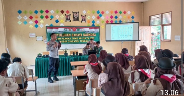 18 Oktober 2025 — Polsek Linge menghadiri sekaligus mengisi kegiatan penyuluhan bahaya penyalahgunaan narkoba, penyuluhan hukum, dan Kamtibmas dalam rangka program TNI Manunggal Membangun Desa (TMMD) ke-126 Kodim 0106/Aceh Tengah. Kegiatan tersebut berlangsung di SMA Negeri 18 Takengon Isaq, Kampung Kute Baru, Kecamatan Linge, Kabupaten Aceh Tengah.