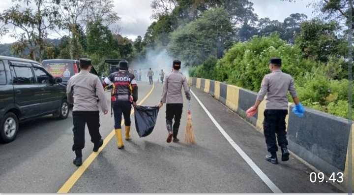 Di hari yang baik ini, bersama personil, kita bergotong royong membersihkan lingkungan baik jalan Umum Kata Kapolsek,