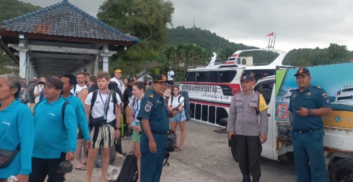 Personil Polsek Padangbai dipimpin Pawas, Iptu Cok Agung Yudha Kusuma, S.H, bersinergi dengan instansi terkait Pelabuhan Padangbai dan Pecalang Desa Adat Padangbai melaksanakan pengawasan dan pengamanan wisatawan di Dermaga Fast Boat Padangbai.