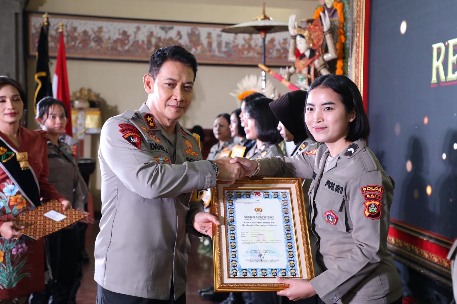 Kepala Kepolisian Daerah Bali, Irjen. Pol. Daniel Adityajaya, S.H., S.IK., M.Si., memberikan penghargaan kepada tujuh Polisi Wanita (Polwan) Polda Bali pada acara syukuran HUT Polwan ke-76 di gedung Presisi Polda Bali, Jum’at (20/9/2024).