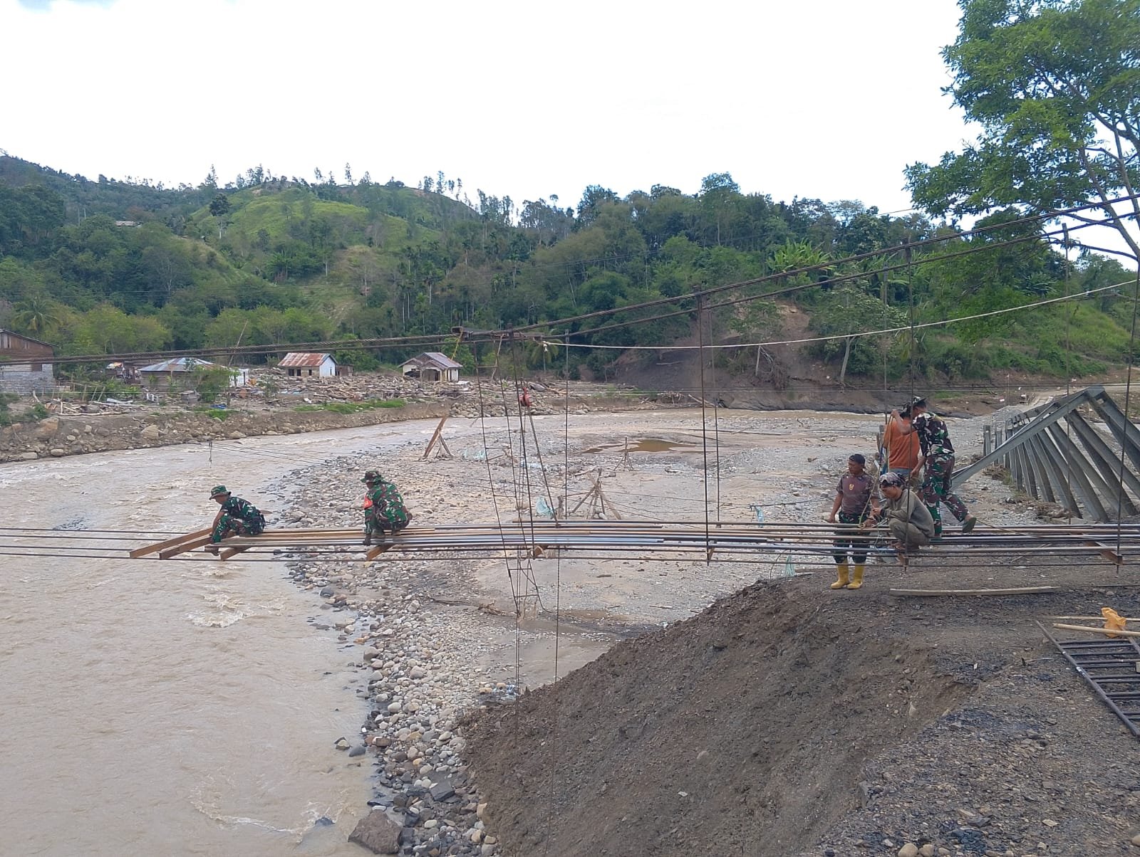Progres pembangunan jembatan gantung di Desa Burlah, Kecamatan Ketol, Kabupaten Aceh Tengah, yang berada di wilayah teritorial Kodim 0106/Aceh Tengah, pada Senin (23/2/2026) pukul 16.55 WIB, telah mencapai 57 persen. Pembangunan jembatan ini dilaksanakan oleh personel TNI AD bersama unsur satuan terkait serta dibantu masyarakat setempat.