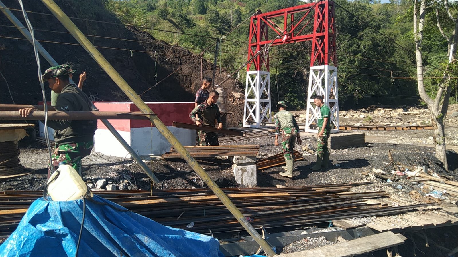 Dari sisi logistik, mobilisasi material telah berjalan dengan baik. Material yang tersedia di lokasi antara lain semen 490 sak, pasir 13 truk, kerikil/batu split lima truk dan satu unit L300, besi beton berbagai ukuran, sling, tiang pylon, angkur, klam hanger, UNP galagar lintang, hingga perlengkapan pengecatan. Ketersediaan bahan ini memastikan pekerjaan dapat berlanjut tanpa hambatan signifikan.