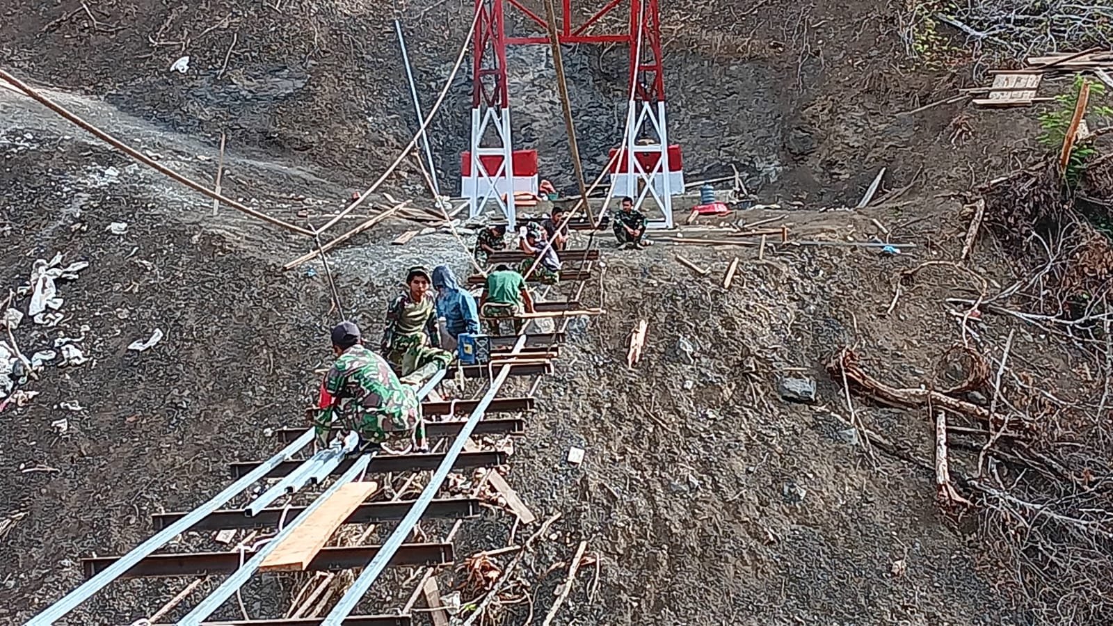Progres pembangunan Jembatan Gantung Kalaili di wilayah teritorial Kodim 0106/Aceh Tengah, Kabupaten Aceh Tengah, pada Jumat (27/2/2026) pukul 11.30 WIB telah mencapai 51,5 persen. Pekerjaan dilakukan oleh personel TNI AD dari Koramil 05/Linge bersama unsur Yon TP 854/DK guna mempercepat konektivitas antar desa di Kecamatan Linge.