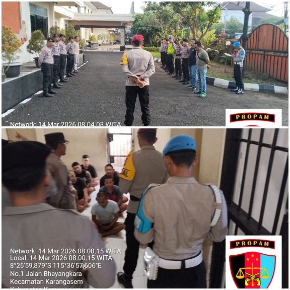 Dalam pelaksanan giat rutin Sipropam Polres Karangasem melaksanakan pengecekan dan pengawasan giat serah terima tugas jaga piket fungsi, Kegiatan ini bertujuan menjaga kedisiplin dan profesionalisme anggota Polri dalam melaksanakan tugas. (Sabtu 14 Maret 2026) pukul 08.00 Wita.