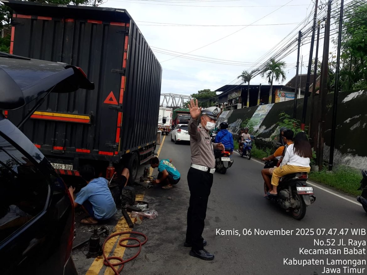 Lamongan – Jatim | 06/11/2025, Anggota Polsek Babat Polres Lamongan sigap melaksanakan quick respon dengan membantu pengaturan lalu lintas dan proses evakuasi sebuah truk yang mengalami patah as roda belakang di Jalan Raya barat Simpang 3 Mira, Kelurahan Babat, Rabu malam (5/11).