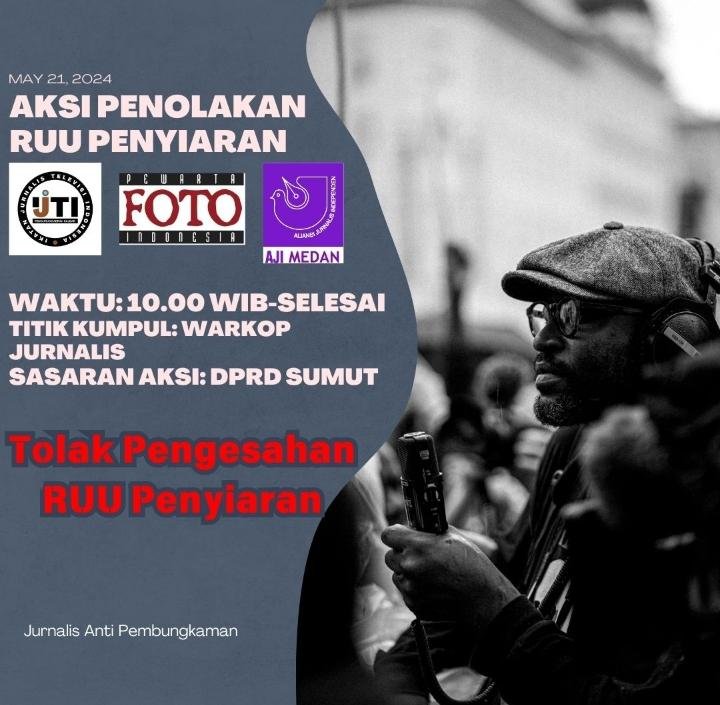 Dengan sambil membawa puluhan spanduk berukuran sedang, jurnalis Medan menolak terbitnya RUU Penyiaran. Jurnalis kian resah, terkait adanya aturan baru yang notabene akan segera disahkan di DPR RI beberapa bulan mendatang.