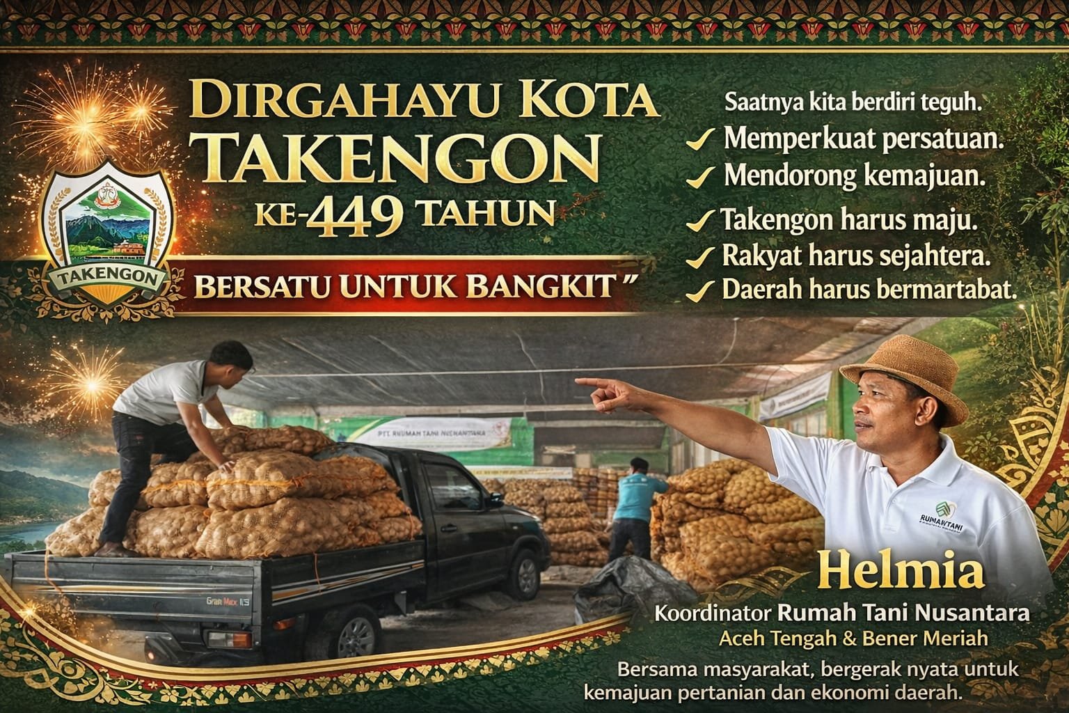 Peringatan hari jadi ke-449 Takengon tahun ini mengusung tema “Bersatu untuk Bangkit”. Semangat tersebut turut digaungkan oleh Rumah Tani Nusantara sebagai bagian dari komitmen memperkuat sektor pertanian di dataran tinggi Gayo.