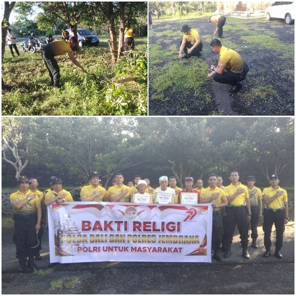 Dalam rangka menyambut Hari Bhayangkara ke-79, Polres Jembrana bersama Forkopicam Melaya menggelar kegiatan Bakti Religi dengan membersihkan area Pura Dang Kahyangan Indra Kusuma, Desa Candikusuma, Kecamatan Melaya, pada Rabu, (11/6/2025).