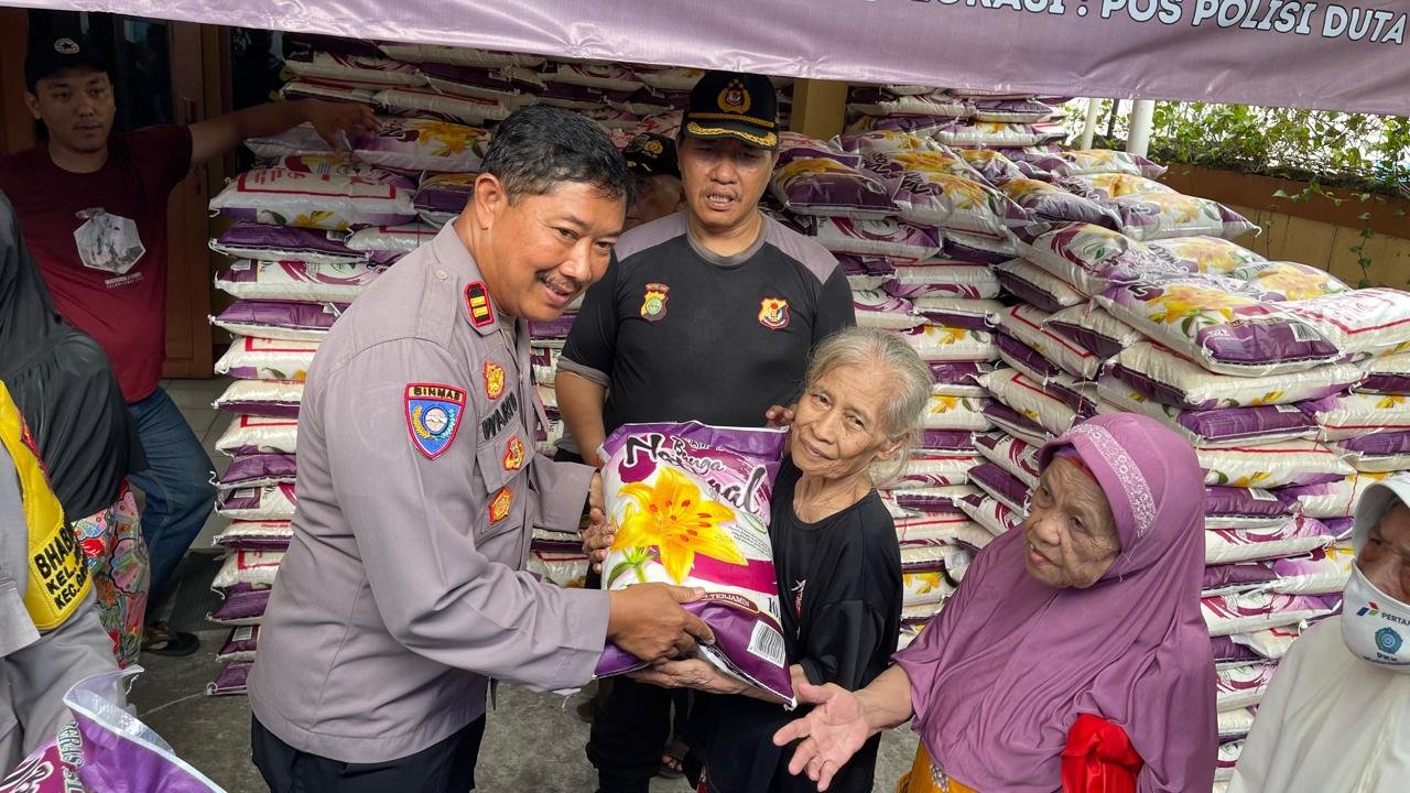 Para petugas dan donatur dengan ramah dan cermat membagikan beras kepada setiap penerima, menunjukkan rasa kepedulian yang tulus dari institusi Kepolisian terhadap masyarakat, khususnya para lansia.