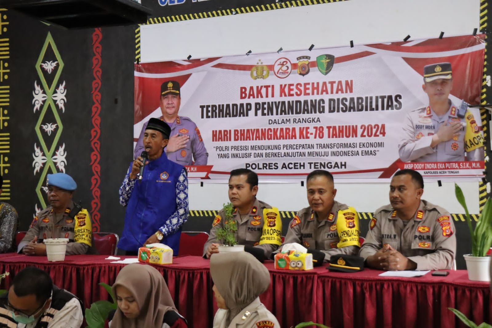 Pembukaan kegiatan bakti kesehatan itu di hadiri Kapolres Aceh Tengah Akbp Dody Indra Eka Putra, diwakili Wakapolres Kompol Yofie, Kabag Ops Akp Rafliandi, Lukman Kepala Sekolah SLB Negeri Kebayakan Takengon, Kapolsek Kota Takengon, Kasi Propam, Kasi Dokkes, Dokter dan mitra Polres Aceh Tengah, dewan guru dan Siswa/i penyandang disabilitas SLB Negeri Kebayakan Takengon.