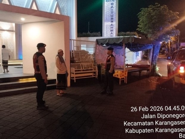 Guna menciptakan situasi kamtibmas yang aman dan kondusif selama bulan suci Ramadan, personel Sat Samapta Polres Karangasem melaksanakan patroli sahur di sejumlah tempat ibadah umat Muslim, di antaranya Masjid Baiturrahman dan Masjid Al-Ikhlas. Pada Kamis 26 Februari 2026 dini hari.