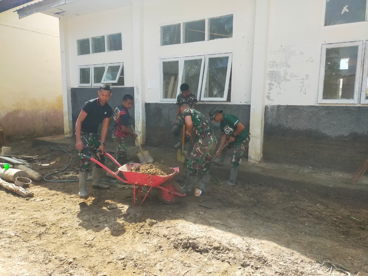 Enam gedung yang terdampak meliputi satu gedung dewan guru dengan tiga ruangan, satu gedung berisi tiga ruang kelas siswa, satu gedung perpustakaan, satu gedung mess sekolah, serta dua gedung rumah dinas guru yang terdiri dari empat unit. Pembersihan dilakukan dengan menyapu, mengeruk lumpur, dan membersihkan dinding bangunan dari sisa material banjir.