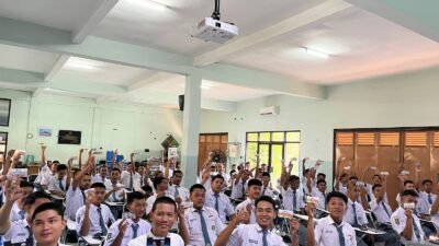 Polres Pekalongan – Polda jateng – Satlantas Polres Pekalongan melaksanakan kegiatan sosialisasi tertib berlalu lintas di SMK Muhammadiyah Kajen, Selasa (15/10). Kegiatan ini dilakukan dalam rangka mendukung pelaksanaan Operasi Zebra Candi 2024, yang dimulai dari tanggal 14 hingga 27 Oktober 2024. Sosialisasi dipimpin oleh Kanit Kamsel Satlantas Polres Pekalongan Ipda Deny, S.H, dan diikuti oleh siswa-siswi SMK Muhammadiyah Kajen.