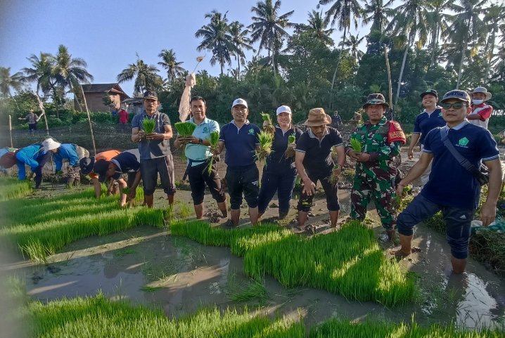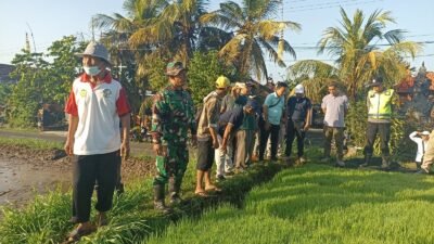 Bersama kelompok tani warga desa setempat, Babinsa Desa Kaliakah Koramil 1617-01/Negara Serda I Putu Eka Adnyana Bersama Bhabinkamtibmas Aiptu Made Ariawan Tanam Padi Inpari 32, Babinsa Serda I Putu Eka Adnyana bersama aparatur desa setempat melaksanakan tanam padi perdana Varietas Inbrid Padi Irigasi (Inpari) 32 diatas lahan seluas 5 hektar Dalam Rangka Program Ketahanan Desa Tahun 2024. Bertempat di Subak Munduk ,Banjar Kaliakah, Desa Kaliakah, Kecamatan Negara, Kabupaten Jembrana. Sabtu (06/07/24).