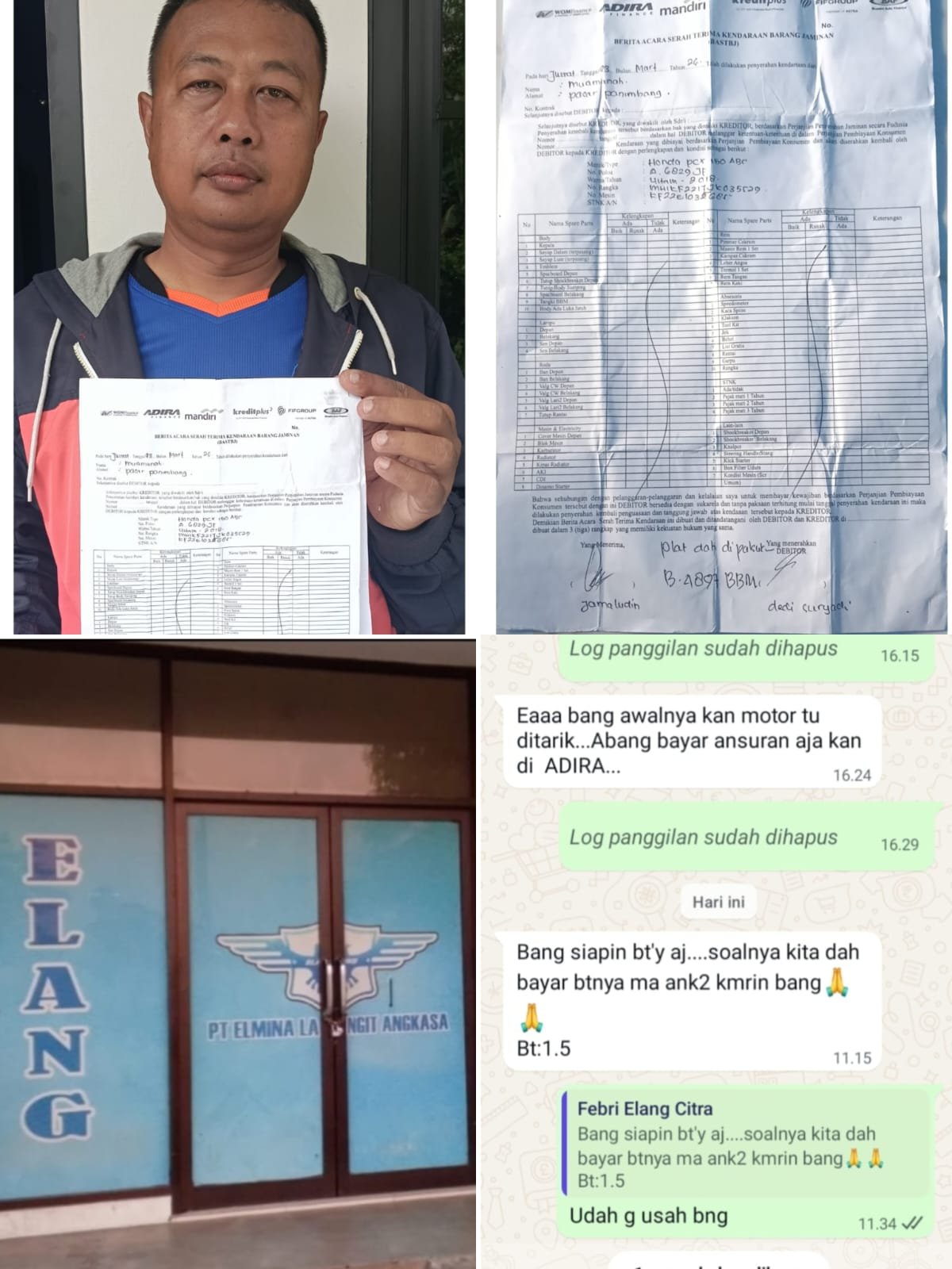 Dikarenakan tidak adanya kejelasan dari pihak leasing Andira Finance, pada hari Rabu tanggal 1-04-2026 sekitar pukul 1 siang mendatangi kantor ELANG guna mencari kejelasan dan keberadaan sepeda motornya.