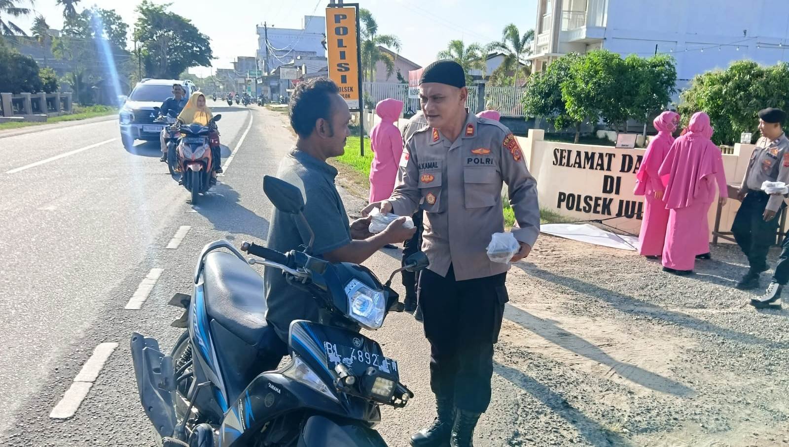 Personel Polsek Julok, Polres Aceh Timur, Polda Aceh dipimpin langsung oleh Kapolsek Iptu M Kamal bersama Bhayangkari Ranting Julok membagikan takjil kepada masyarakat pengguna jalan yang melintas di depan Mapolsek, Kamis, (12/03/2026) sore.