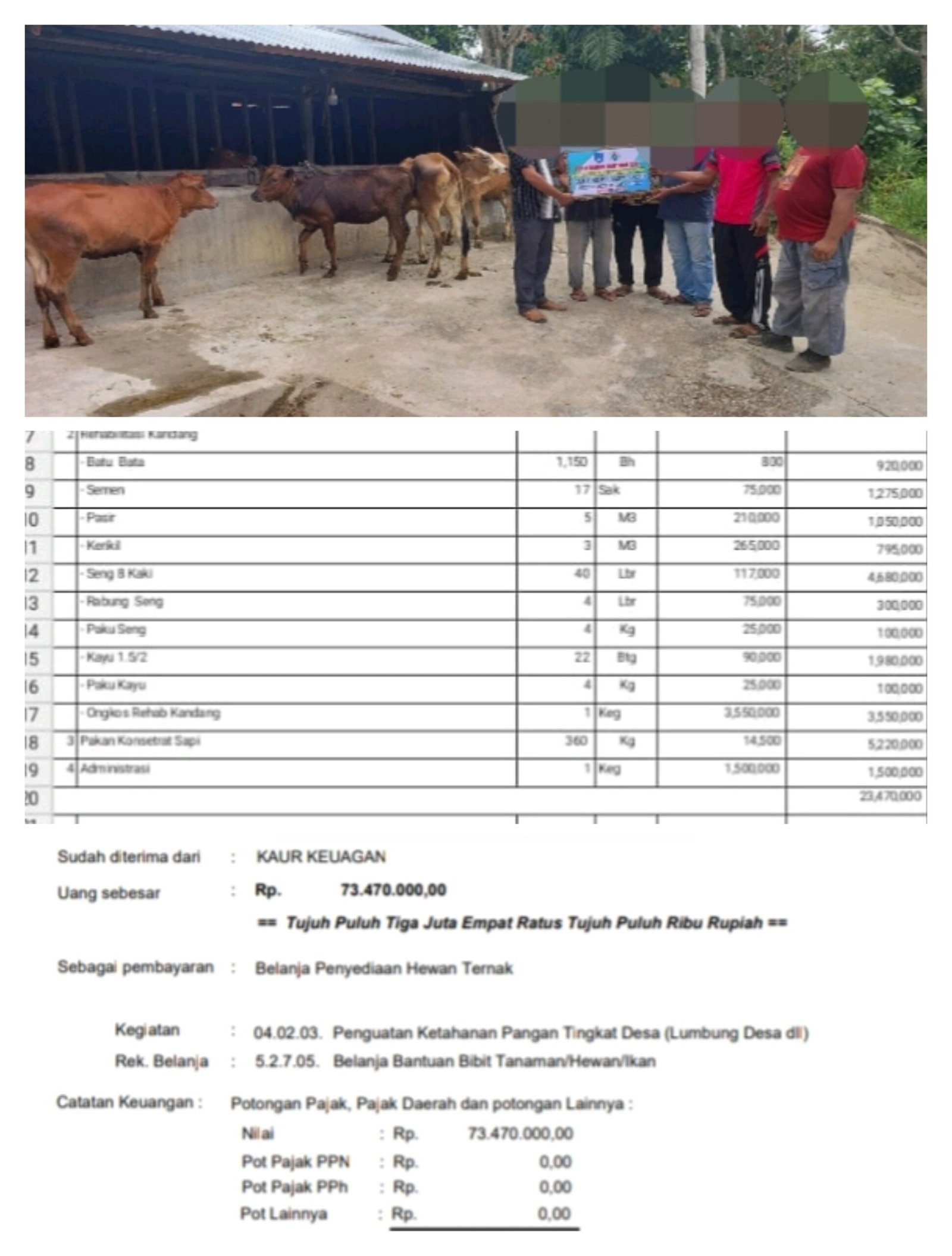 Untuk selanjutnya kembali, dari nara sumber yang ke dua. Yang dapat di percaya itu, sesuai data yang telah terurai. Menyebutkan, dalam keterangan lembaran penerimaan dana desa. Pemerintah gampong meurandeh aceh kota langsa, tanda bukti pengeluaran uang. Nomor: 00226/KWT/04.2014/2024. Sumber dana, DDS. Sudah di terima dari, kaur keuangan. Uang sebesar, Rp. 73, 470.000,00. ==Tujuh puluh tiga juta, empat ratus tujuh puluh ribu rupiah==. Sebagai pembayaran, belanja penyedia hewan ternak. Kegiatan: 04.02.03, penguatan ketahanan pangan tingkat desa (lumbung desa dan lain-lain). Rekening belanja, 5.2,7.0,5. Belanja bantuan bibit tanaman/hewan/ikan, catatan keuangan: potongan pajak, pajak daerah dan potongan lainnya. Nilai, Rp.73, 470. 000,00. Pot pajak PPN, Rp. 0,00. Pot pajak PPh, Rp. 0,00. Pot pajak lainnya, Rp.0,00. Di bayarkan, Rp.73,470.000,00. Meurandeh aceh, 07 mau 2024. Yang memberi, kaur keuangan: Adam S.H, I yang menerima M Yunus.